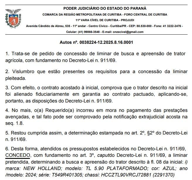 Baixar ImagemDecisão judicial que deferiu a liminar de busca e apreensão e expediu mandado para apreensão do trator NEW HOLLAND TL 5.90