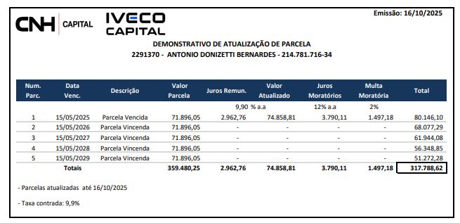 Planilha apresentada pelo Banco CNH/IVECO Capital em 16/10/2025, indicando débito total de R$ 317.788,62. Taxas aplicadas: 9,90% a.a. de juros remuneratórios, 12% a.a. de juros moratórios e 2% de multa. Parcela inadimplida em 15/05/2025 (vencimento anual).